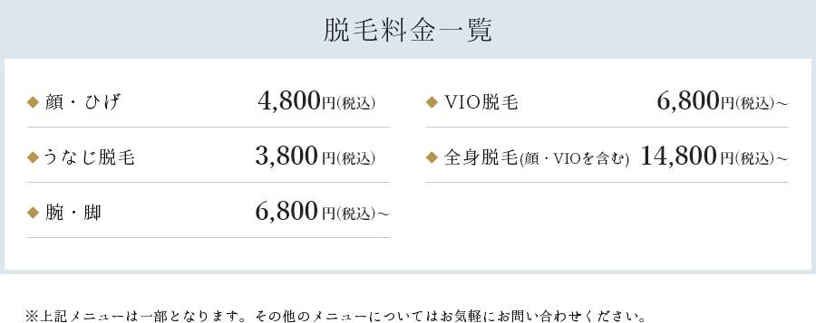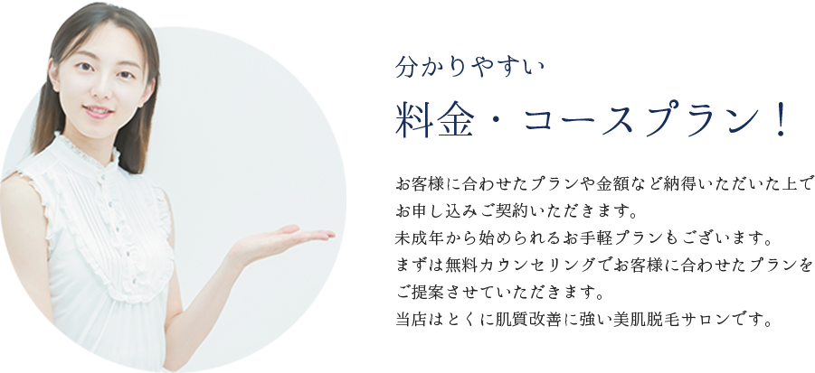 カウンセリングでは、お客様のご要望お聞きし肌の状態などを見させていただきます。それから、当店の脱毛コースのご説明や毛周期や自己処理の頻度と方法、アフターケア(保湿)の仕方、解約についてなど詳しくご説明させていただきます。お客様が納得ゆくまでご相談ください!